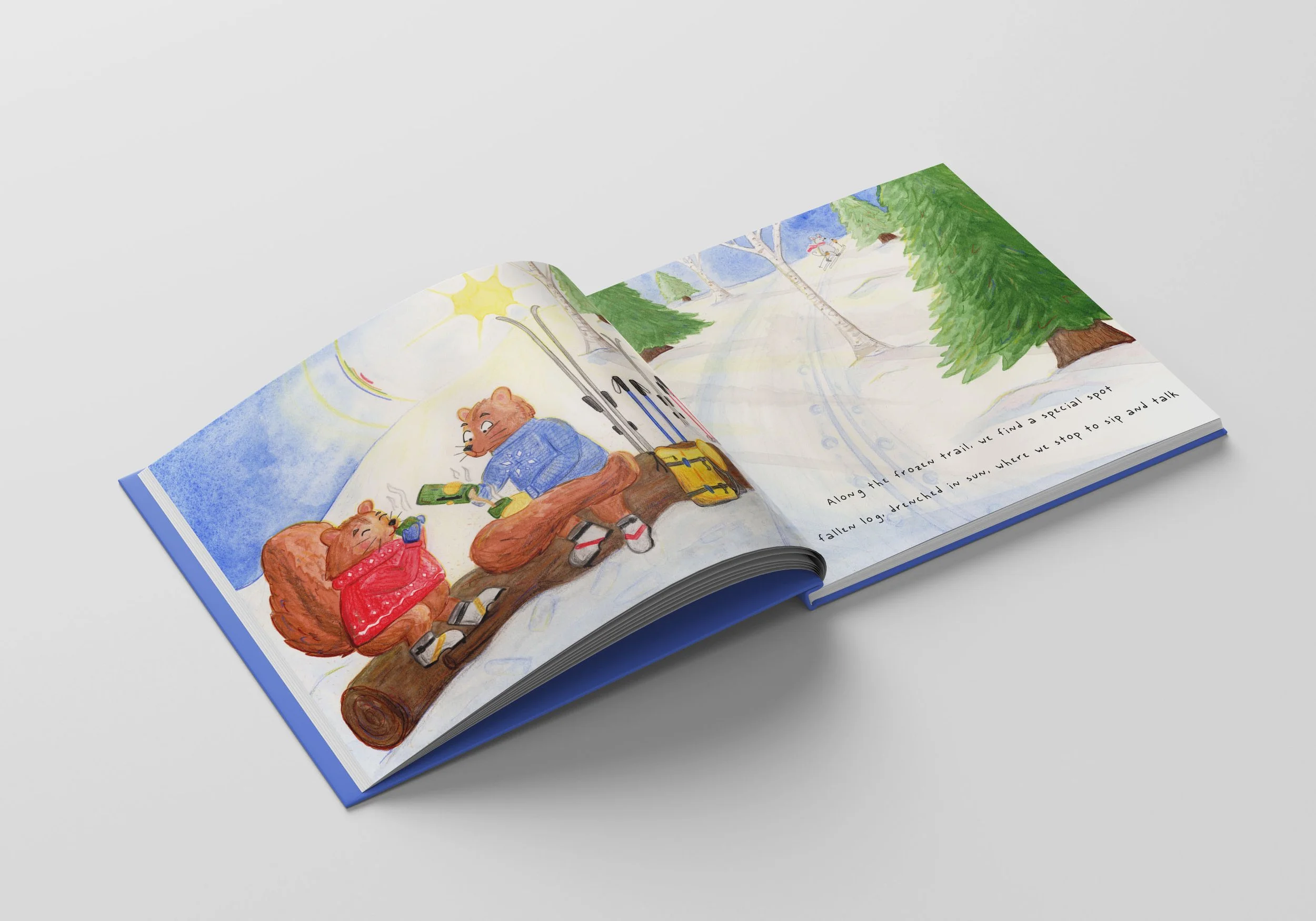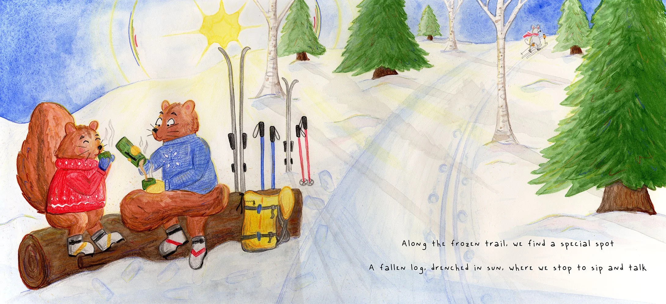 That moment was so peaceful. The quiet of the forest seemed to settle around us and the snow sparkled bright. I wanted to capture that feeling in this artwork. I imagine the rest of the story to be about slowing down and noticing the small things.